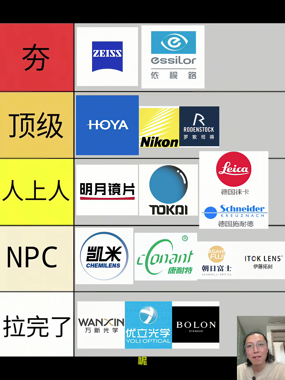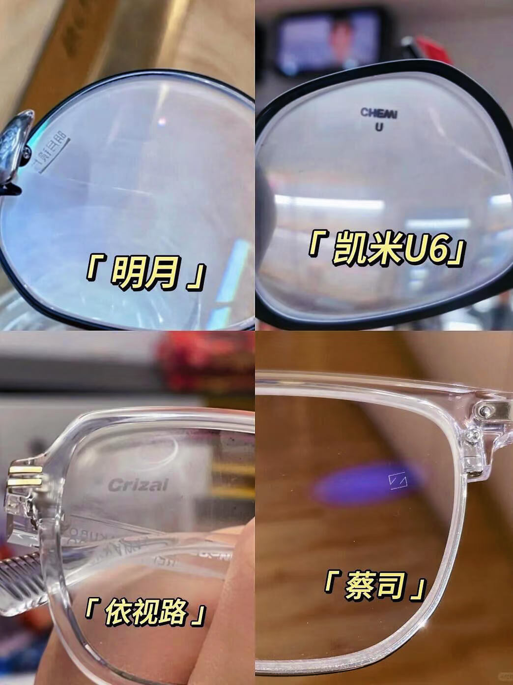 接下来是选镜片,不差钱的一律上蔡司(A系列除外,蔡司视特耐不是蔡司),其次是依视路,性价比选择国产的明月、凯米等