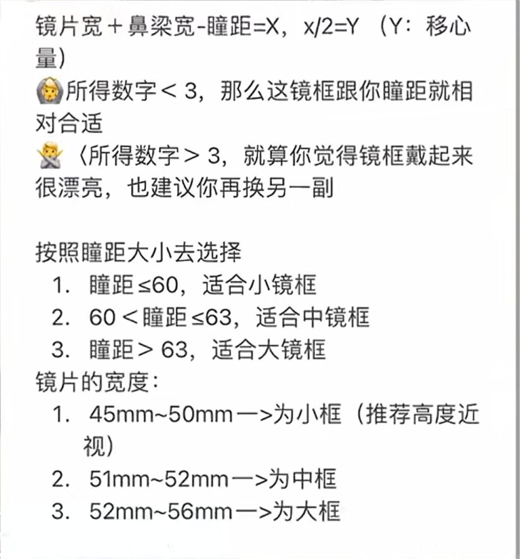 选镜框尺寸一般有如下公式(非万能,按照个人实际试戴情况做调整):