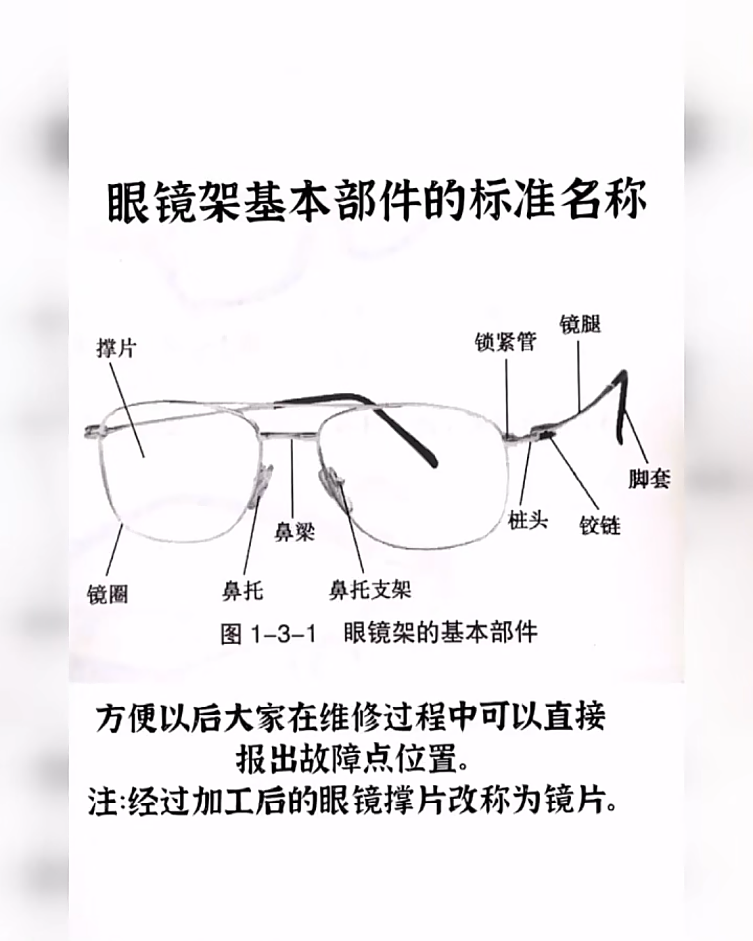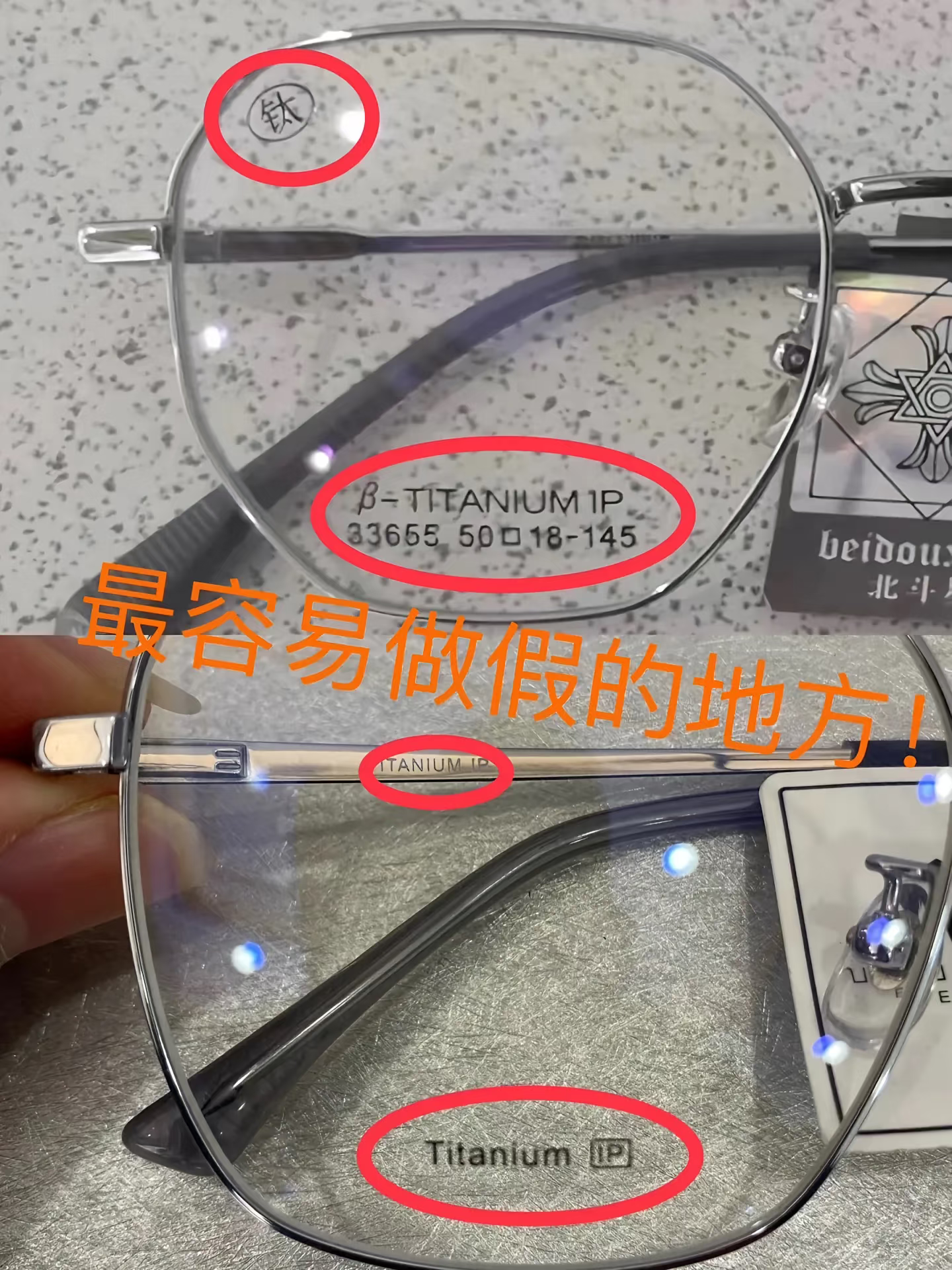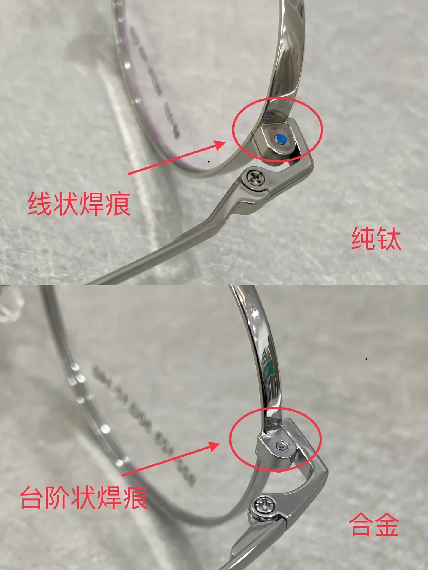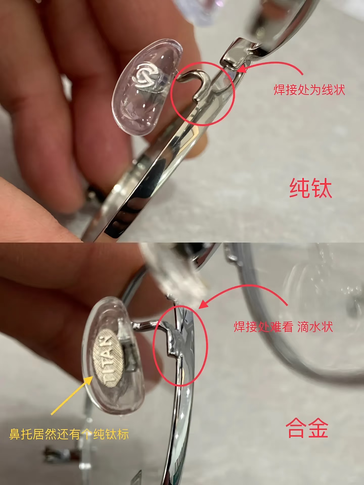 辨别钛框的其他技巧:鼻托支架的连接处的工艺、柱头连接处的工艺,这两处均为清晰的线状才是纯钛,否则不是。