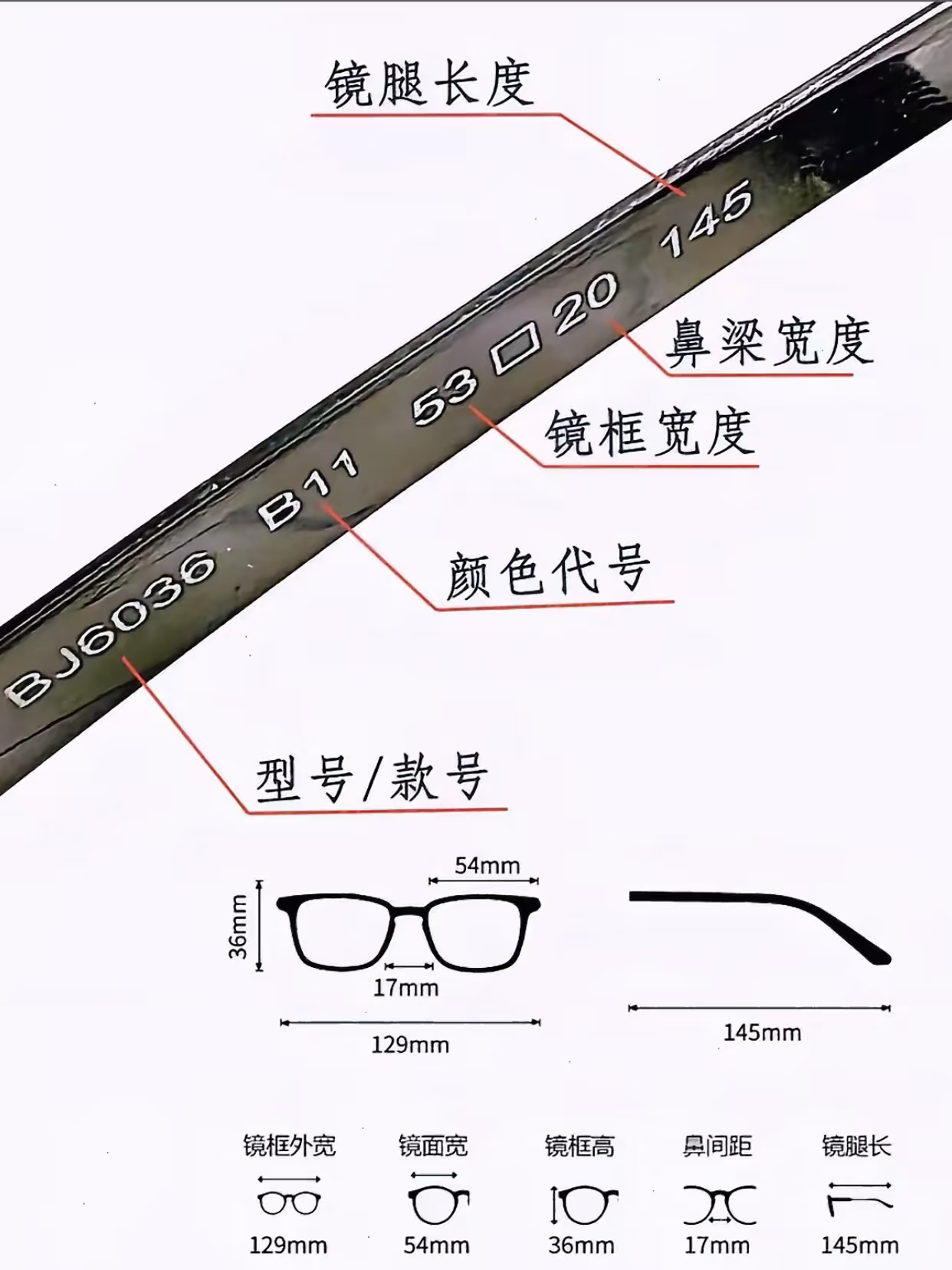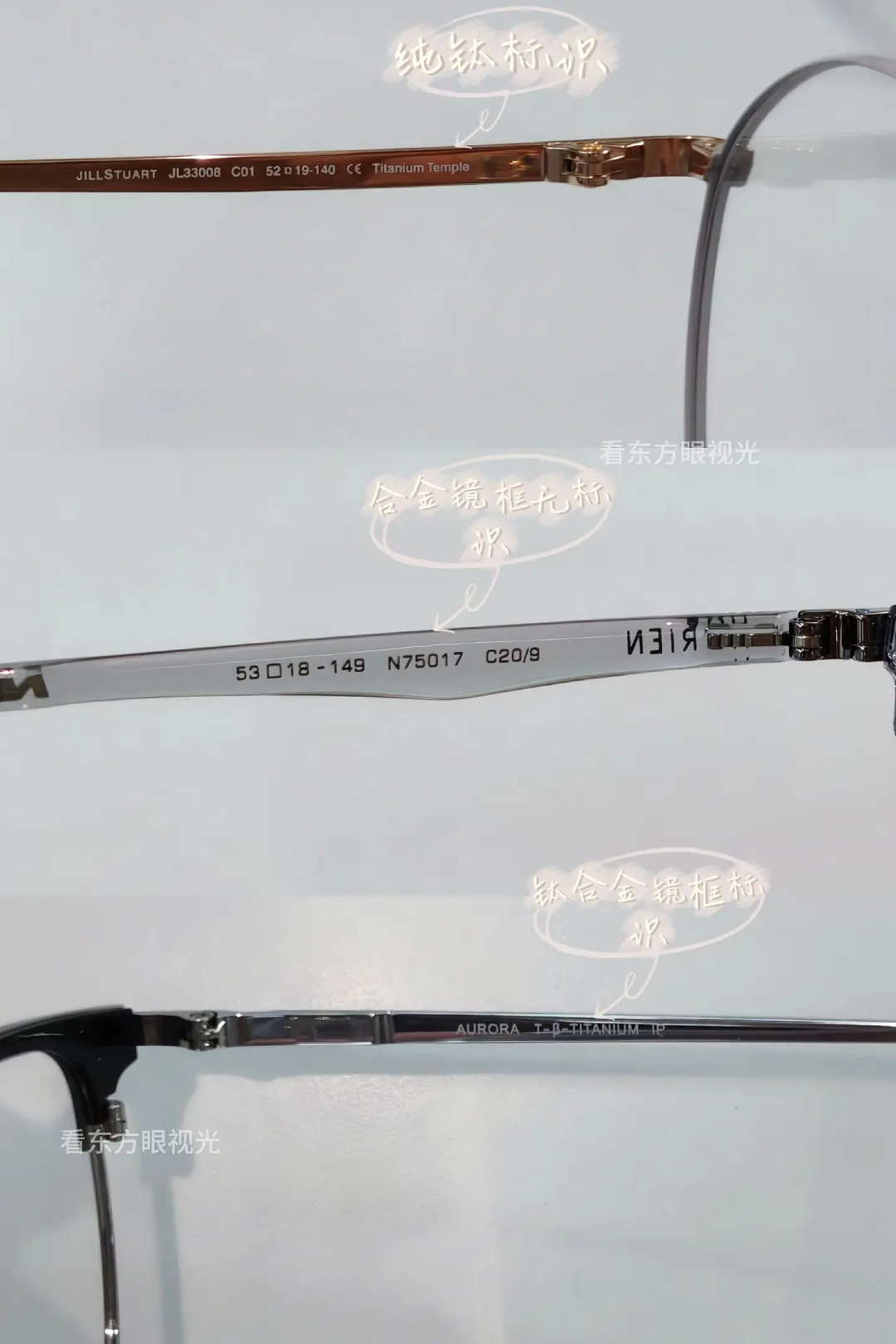 一般镜腿上都会标出该镜架的镜框 中梁 单镜腿长这三个参数(格式:镜片宽口鼻梁宽-镜腿长),纯钛框还会单独标出“Titanium”的标志