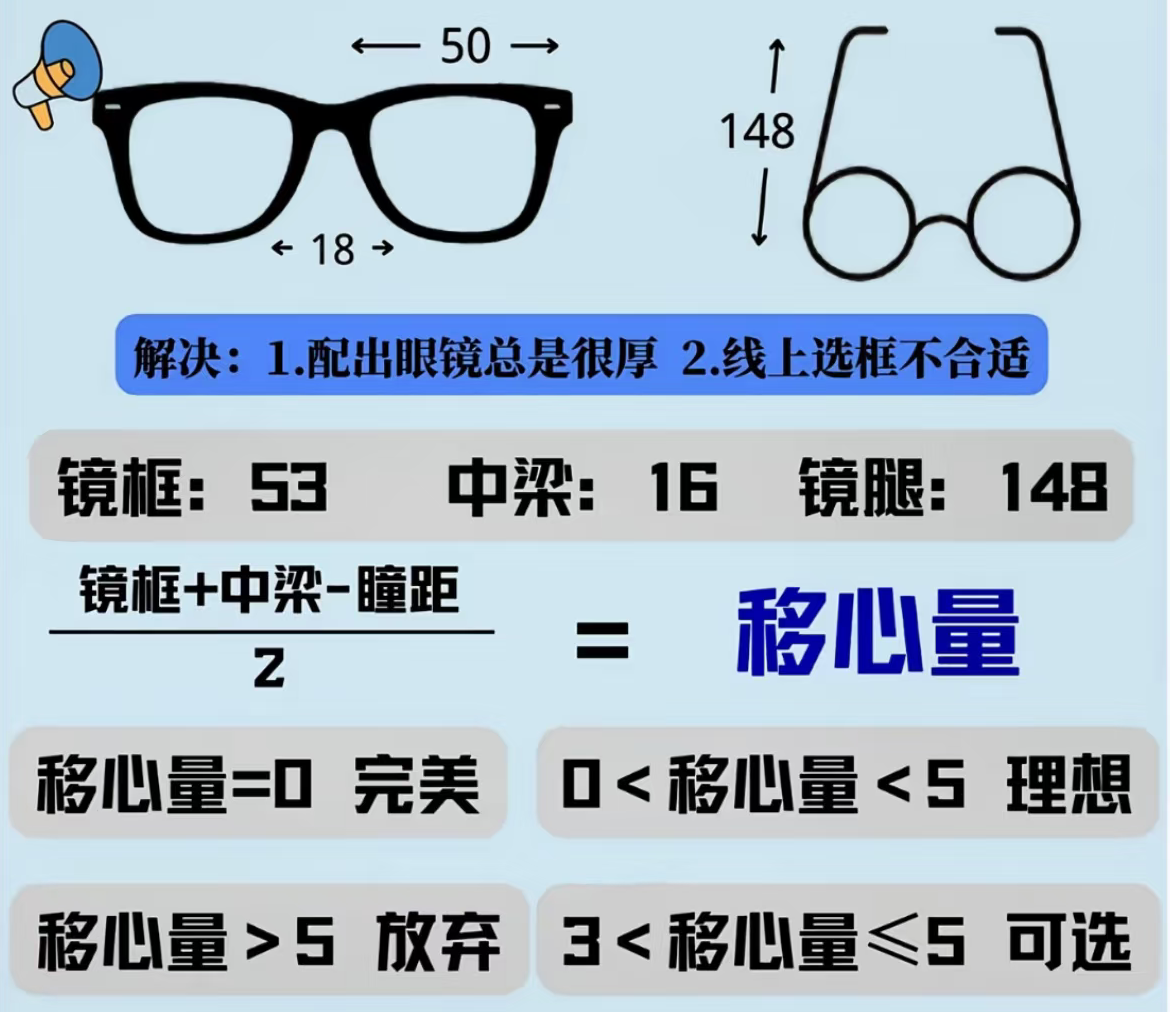判断一个镜框是否合适的标准:镜圈光学中心尽量和瞳孔重合,完全重合是最好,这样做出来的镜片会比较薄,镜片边缘的畸变也会比较少,如果没法完全重合或你觉得美观度打了折扣,可以适当放大镜框或中梁的宽度。