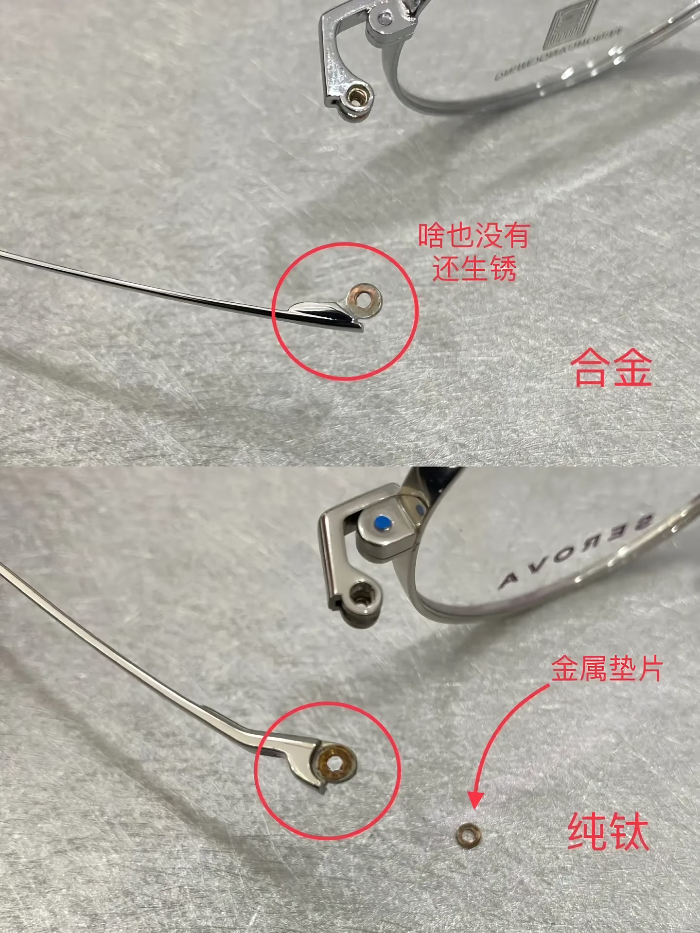 挑选纯钛框有辨别技巧,首先鼻托支架上需要有“小台阶”,其次柱头处要有铜垫片,如果没有这两个,说明不是纯钛框,只是部分钛甚至是合金框,有些商家为了降低成本,会将合金也说成纯钛,而合金是没有“小台阶”和垫片的。